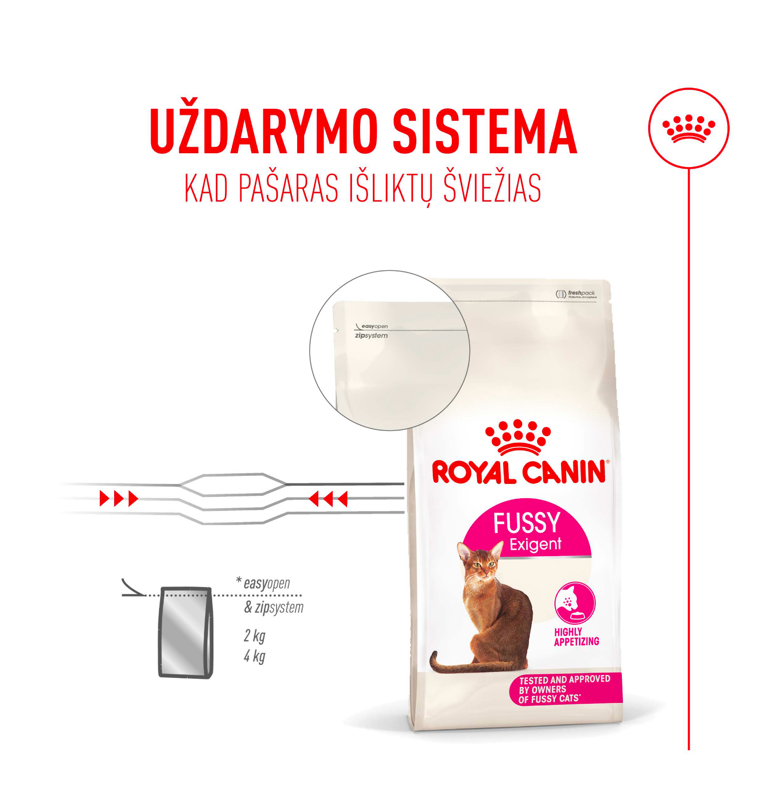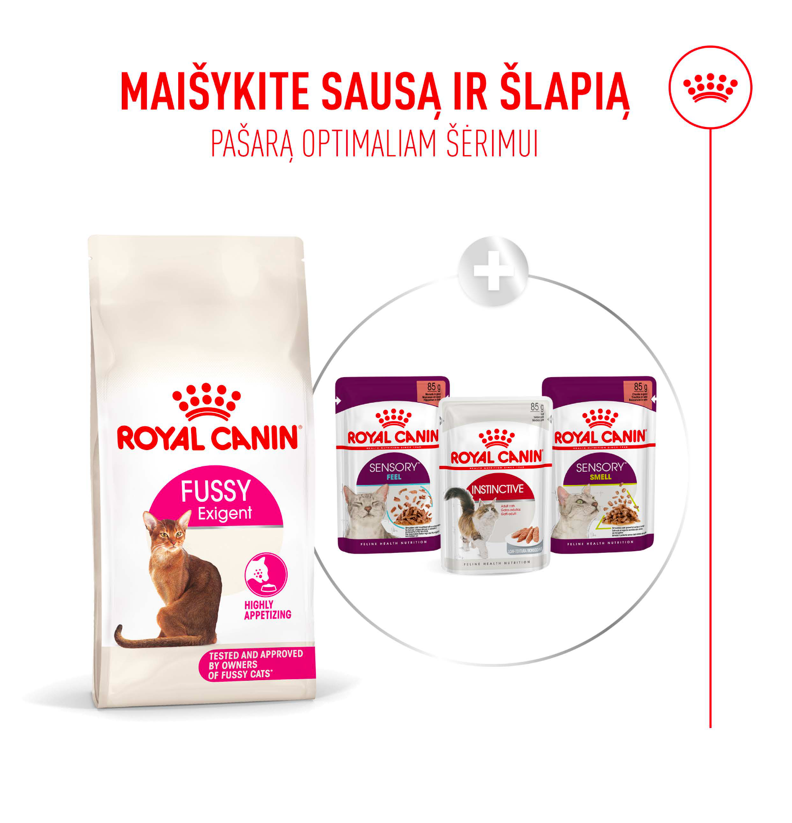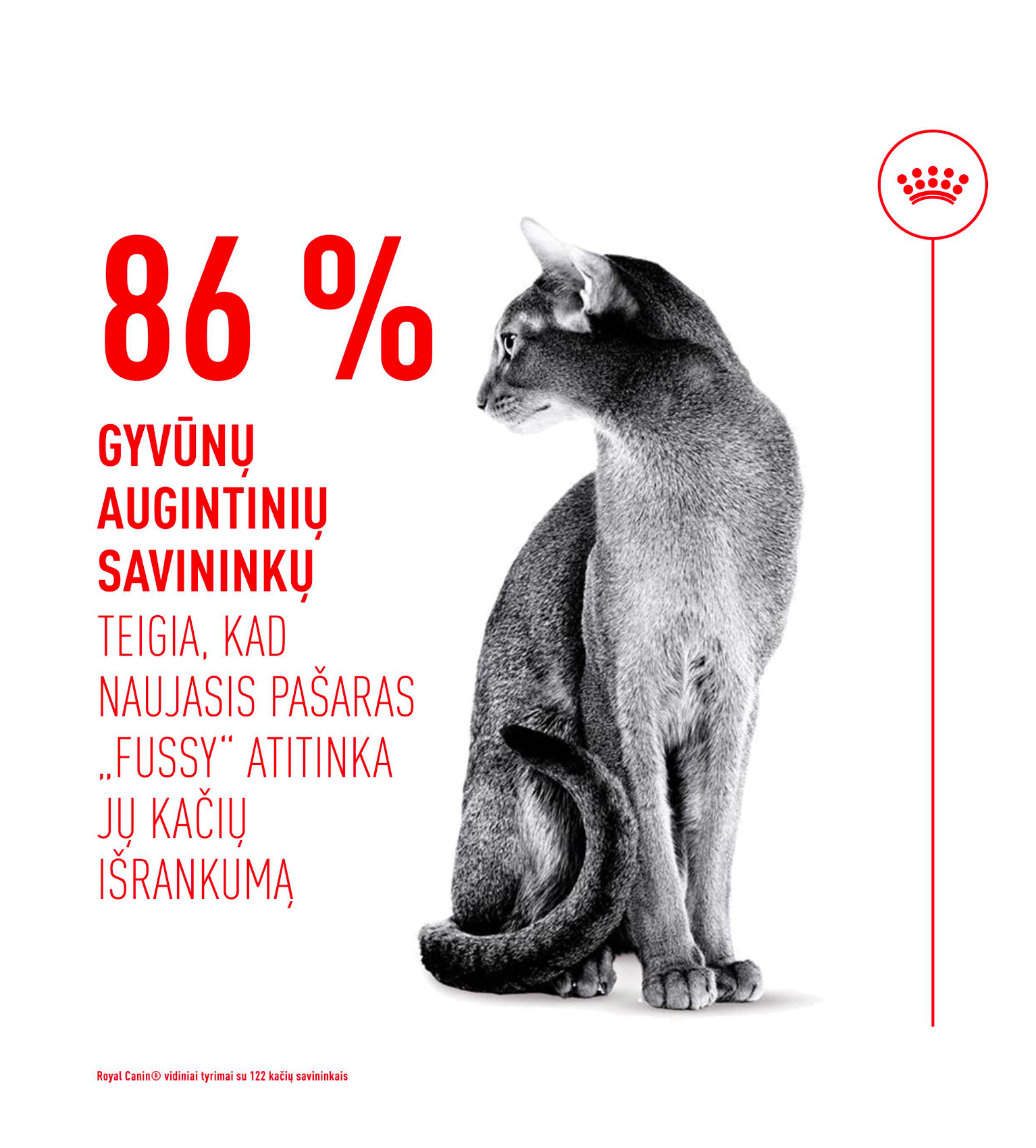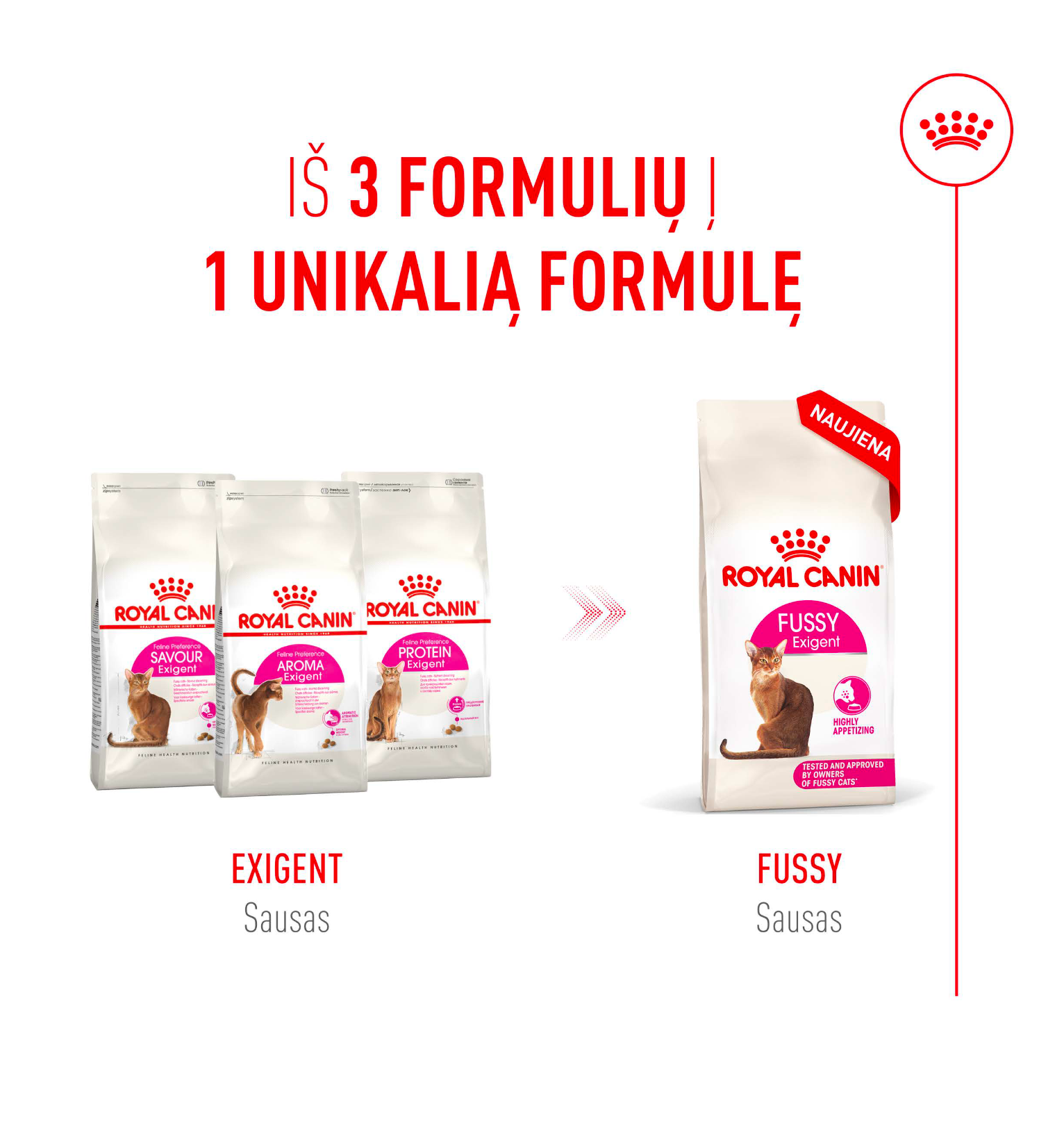 „Royal Canin“ bendradarbiauja su veterinarinės mitybos specialistais, kurdama maisto sprendimus, padedančius palaikyti optimalią kačių sveikatos būklę. Suprantame, kad daugeliui kačių augintojų sudėtinga rasti pašarą, kurį jų augintinė iš tiesų norėtų ėsti. Išrankias kates dažnai sunku pamaloninti – jos neretai atmeta naują maistą, todėl tampa sudėtinga užtikrinti, kad jos gautų visas būtinas maistines medžiagas. Remiantis ketverių metų tyrimais, ROYAL CANIN® „Fussy“ yra ypač gerai ėdama formulė, užtikrinanti visavertę ir subalansuotą mitybą išrankioms katėms. Ši individualiai pritaikyta mityba buvo išbandyta ir įvertinta išrankių kačių augintojų*, iš kurių 86 % pastebėjo pagerėjusius savo augintinių valgymo įpročius. Ši dieta taip pat tinka sterilizuotoms katėms. Ypač skanus: kad patiktų net pačioms išrankiausioms katėms, ROYAL CANIN® „Fussy“ mityba kruopščiai sukurta išlaikant tikslų ingredientų balansą, viliojančius aromatus ir malonią, traškią granulių tekstūrą. Šlapimo takų sveikatos palaikymas: sukurta padėti palaikyti sveiką šlapimo sistemą. Kūno svorio kontrolė: išrankios katės dažnai suėda labai mažai per dieną. Siekiant patenkinti jų kasdienius mitybinius poreikius, ROYAL CANIN® „Fussy“ pašaras yra kaloringas ir turtingas baltymais. Ši visavertė ir subalansuota mityba, turinti 40 % baltymų ir pasižyminti dideliu ėdamumu, padeda palaikyti normalų kūno svorį. Siekiant pagerinti skonį ir valgymo patirtį, „Fussy“ formulė sujungia tris ankstesnes „Exigent“ dietas – „Savour“, „Aroma“ ir „Protein“ – į vieną visapusiškai subalansuotą produktą – ROYAL CANIN® „Fussy“. Perėjimas nuo vieno pašaro prie kito turėtų vykti palaipsniui, per 7–10 dienų laikotarpį.