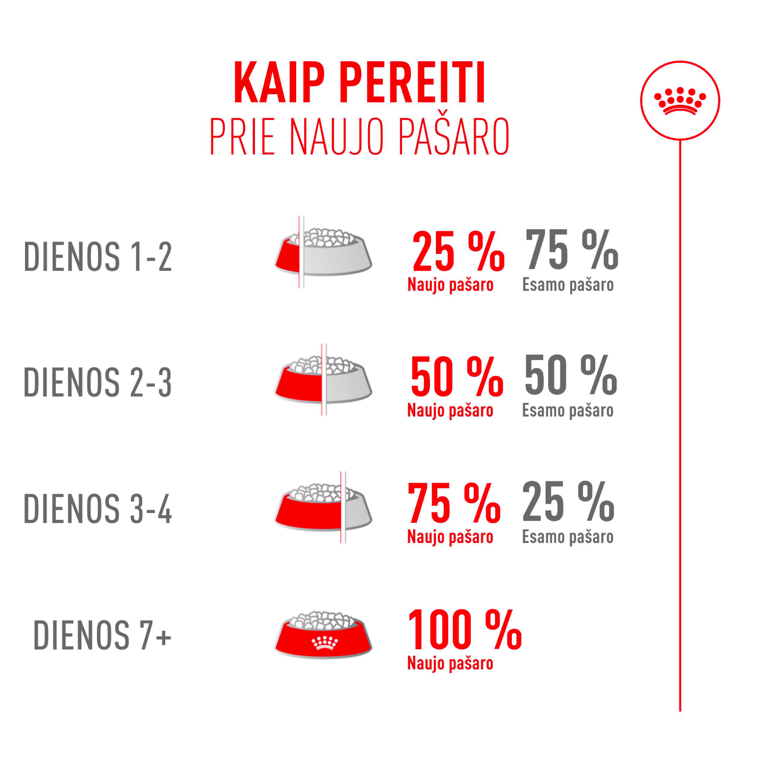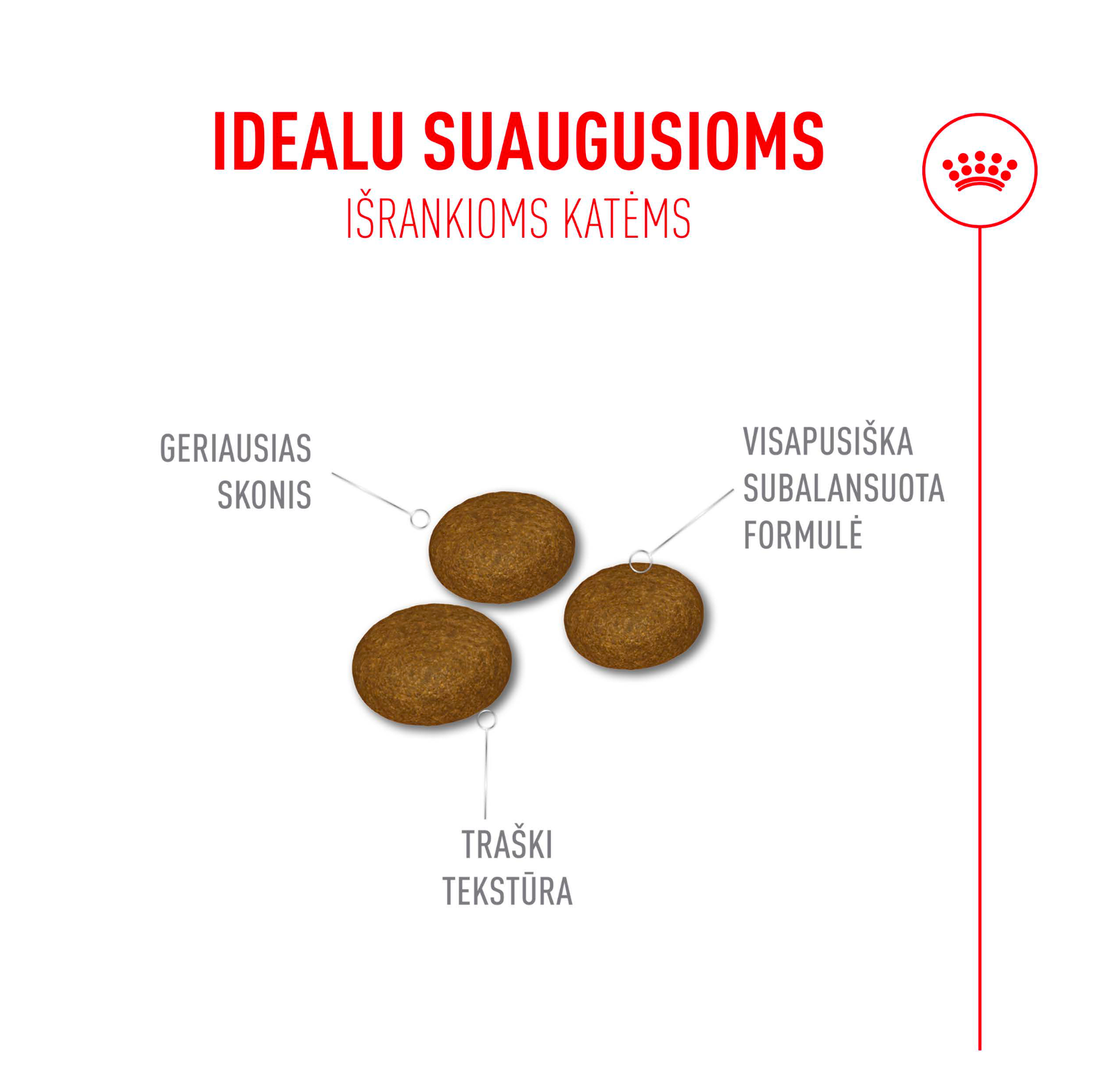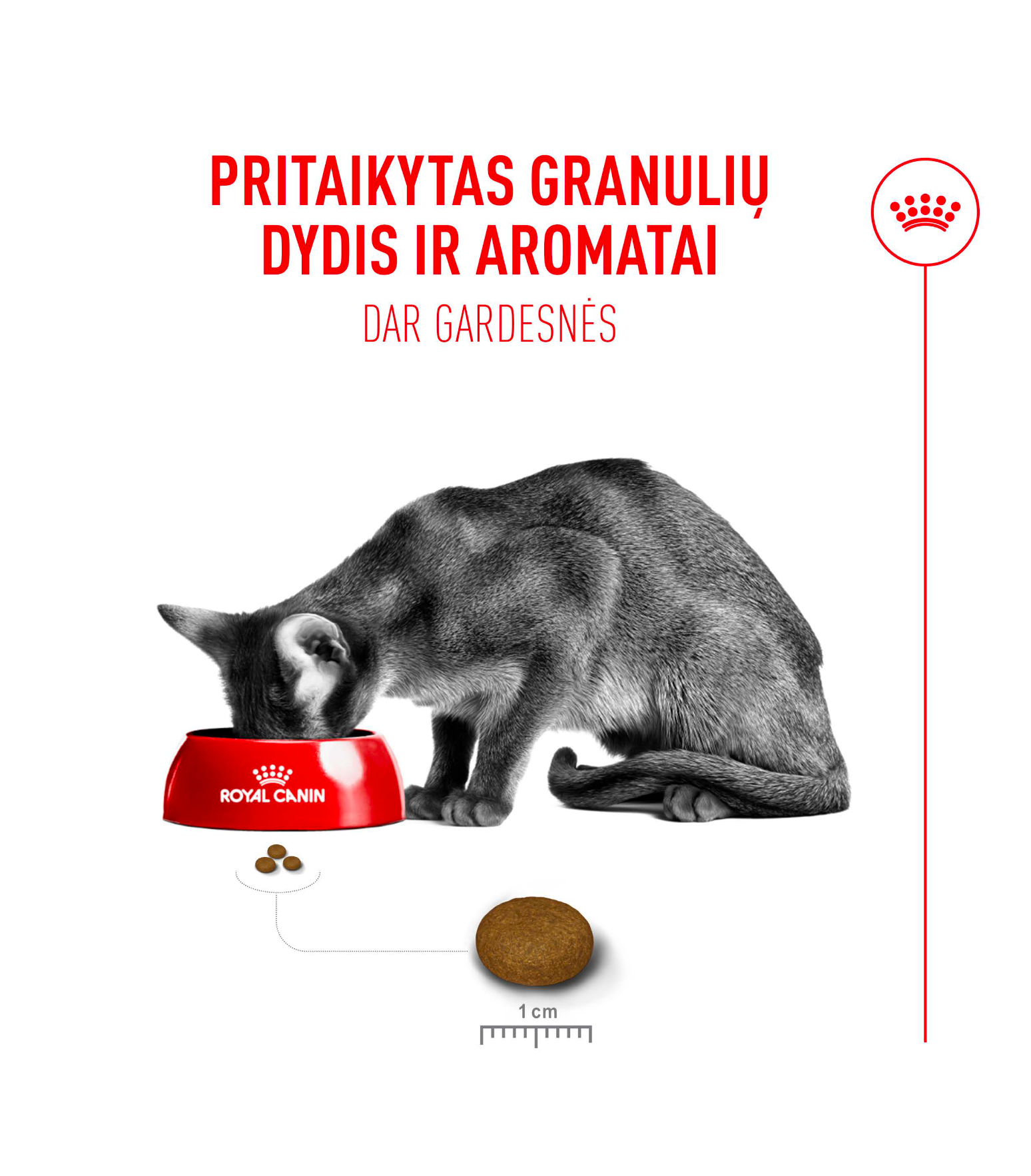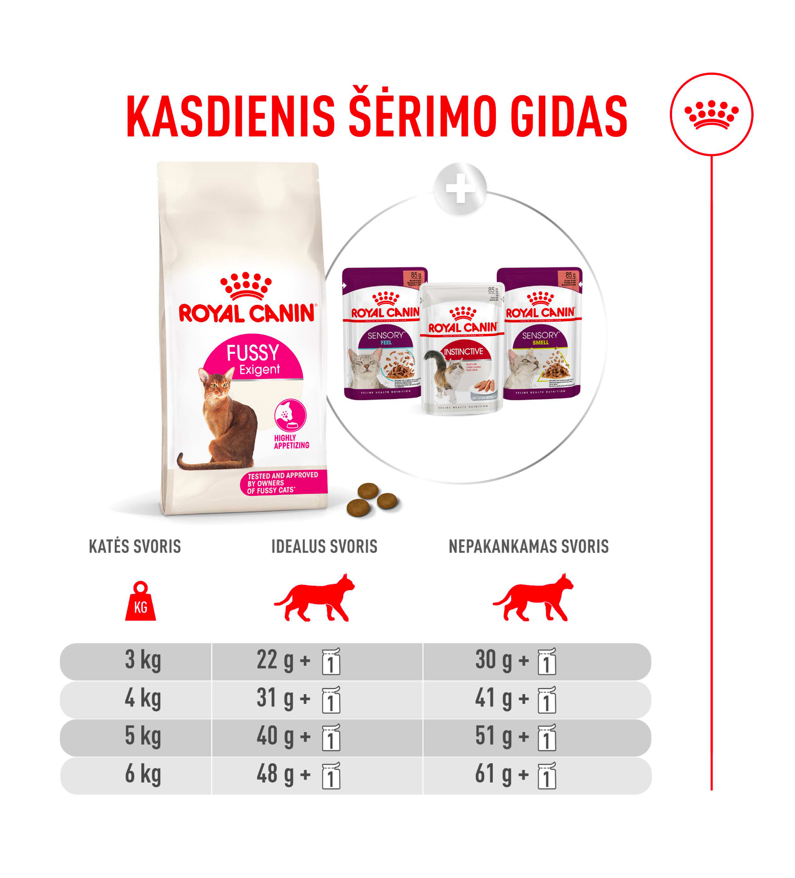 „Royal Canin“ bendradarbiauja su veterinarinės mitybos specialistais, kurdama maisto sprendimus, padedančius palaikyti optimalią kačių sveikatos būklę. Suprantame, kad daugeliui kačių augintojų sudėtinga rasti pašarą, kurį jų augintinė iš tiesų norėtų ėsti. Išrankias kates dažnai sunku pamaloninti – jos neretai atmeta naują maistą, todėl tampa sudėtinga užtikrinti, kad jos gautų visas būtinas maistines medžiagas. Remiantis ketverių metų tyrimais, ROYAL CANIN® „Fussy“ yra ypač gerai ėdama formulė, užtikrinanti visavertę ir subalansuotą mitybą išrankioms katėms. Ši individualiai pritaikyta mityba buvo išbandyta ir įvertinta išrankių kačių augintojų*, iš kurių 86 % pastebėjo pagerėjusius savo augintinių valgymo įpročius. Ši dieta taip pat tinka sterilizuotoms katėms. Ypač skanus: kad patiktų net pačioms išrankiausioms katėms, ROYAL CANIN® „Fussy“ mityba kruopščiai sukurta išlaikant tikslų ingredientų balansą, viliojančius aromatus ir malonią, traškią granulių tekstūrą. Šlapimo takų sveikatos palaikymas: sukurta padėti palaikyti sveiką šlapimo sistemą. Kūno svorio kontrolė: išrankios katės dažnai suėda labai mažai per dieną. Siekiant patenkinti jų kasdienius mitybinius poreikius, ROYAL CANIN® „Fussy“ pašaras yra kaloringas ir turtingas baltymais. Ši visavertė ir subalansuota mityba, turinti 40 % baltymų ir pasižyminti dideliu ėdamumu, padeda palaikyti normalų kūno svorį. Siekiant pagerinti skonį ir valgymo patirtį, „Fussy“ formulė sujungia tris ankstesnes „Exigent“ dietas – „Savour“, „Aroma“ ir „Protein“ – į vieną visapusiškai subalansuotą produktą – ROYAL CANIN® „Fussy“. Perėjimas nuo vieno pašaro prie kito turėtų vykti palaipsniui, per 7–10 dienų laikotarpį.
