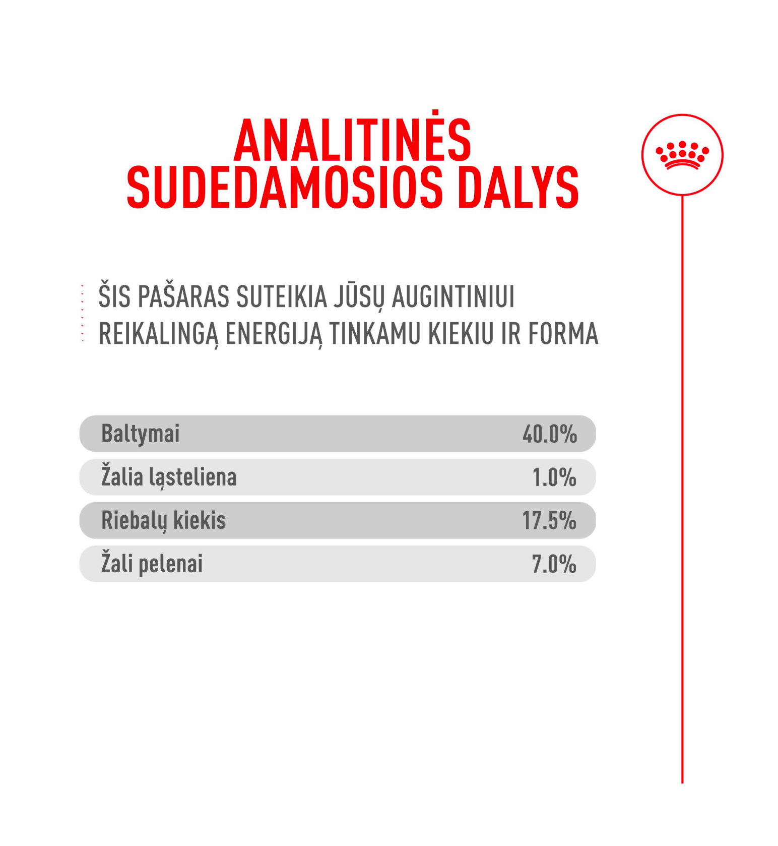 Žali baltymai – 40 %, žali riebalai – 17,5 %, žali pelenai – 7 %, žalia ląsteliena – 1 %. Metabolizuojama energinė vertė – 4175 kcal/kg.